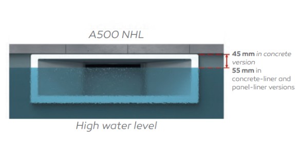 The A500 NHL skimmer raises the water level to just 45 mm below the base. The gap between the water level and the coping is
